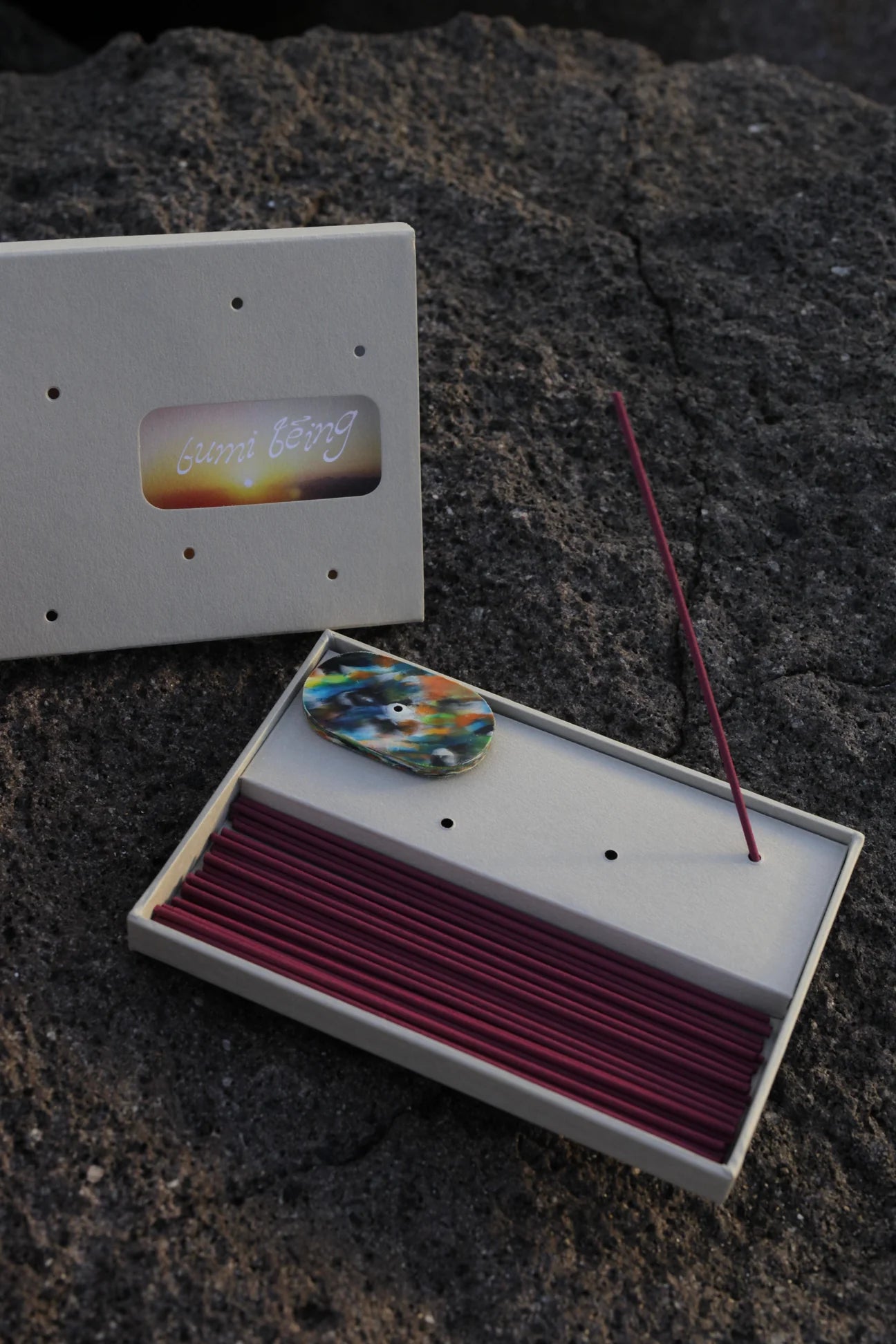 Bumi Being Kits include 25 incense sticks as well as a one of a kind, up cycled plastic holder tablet